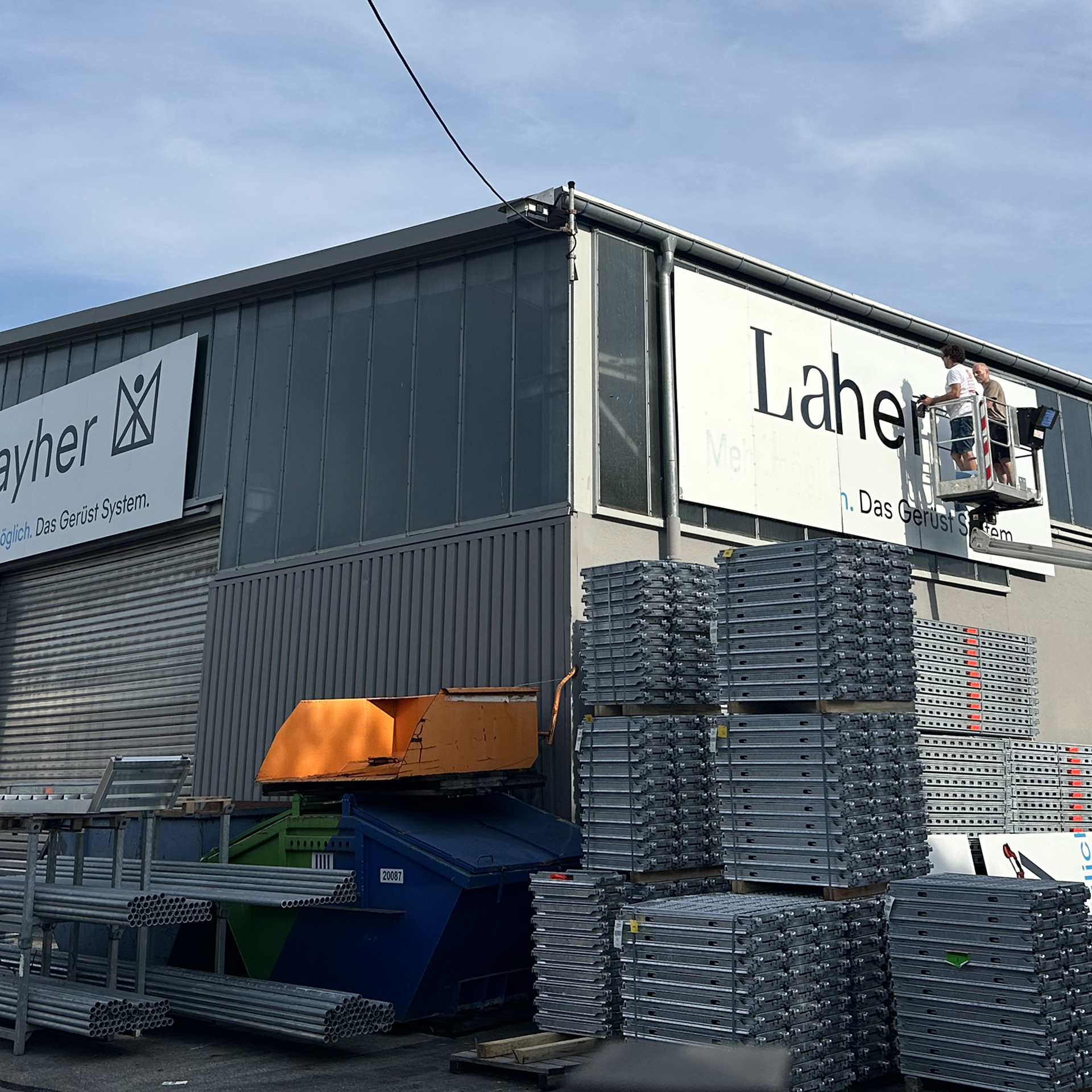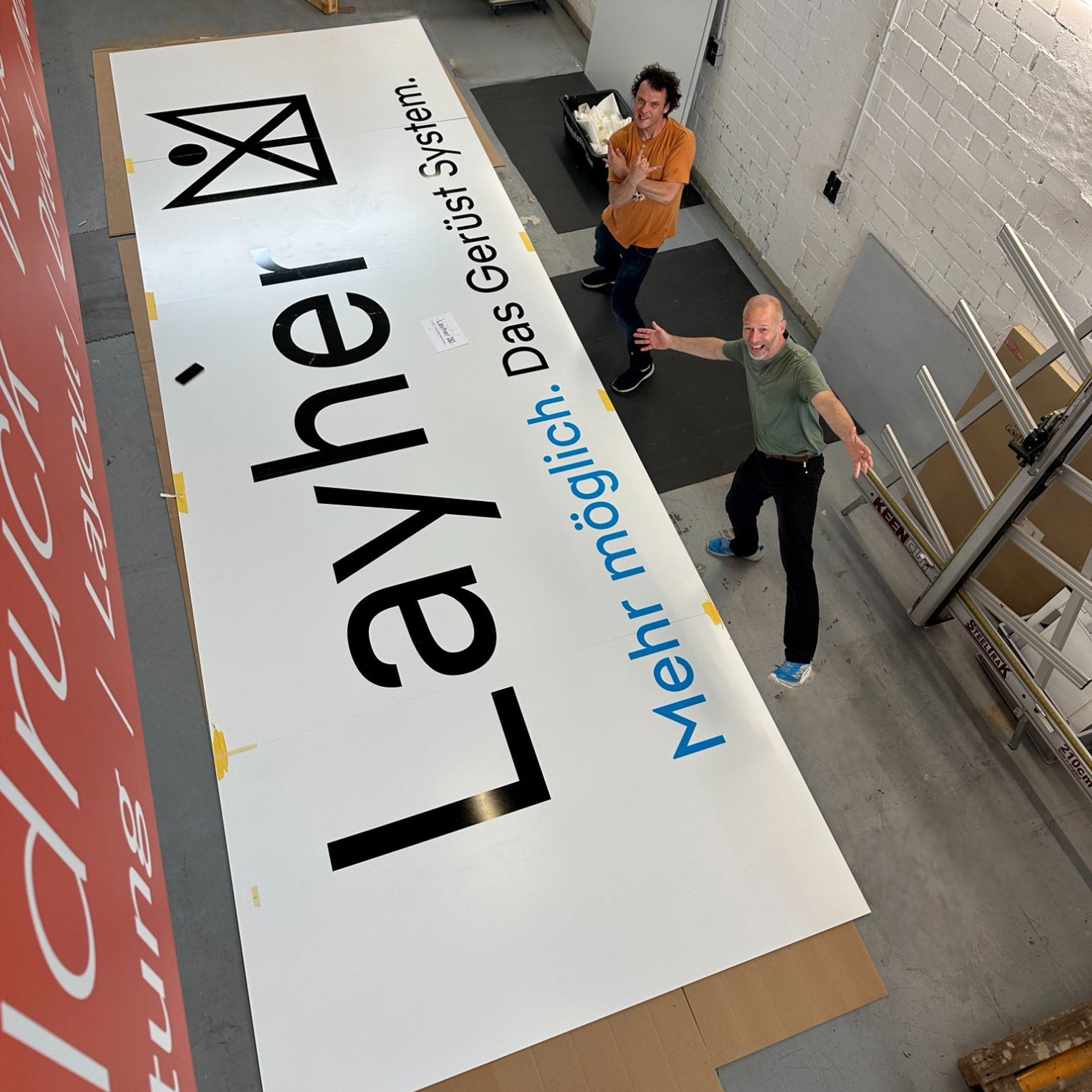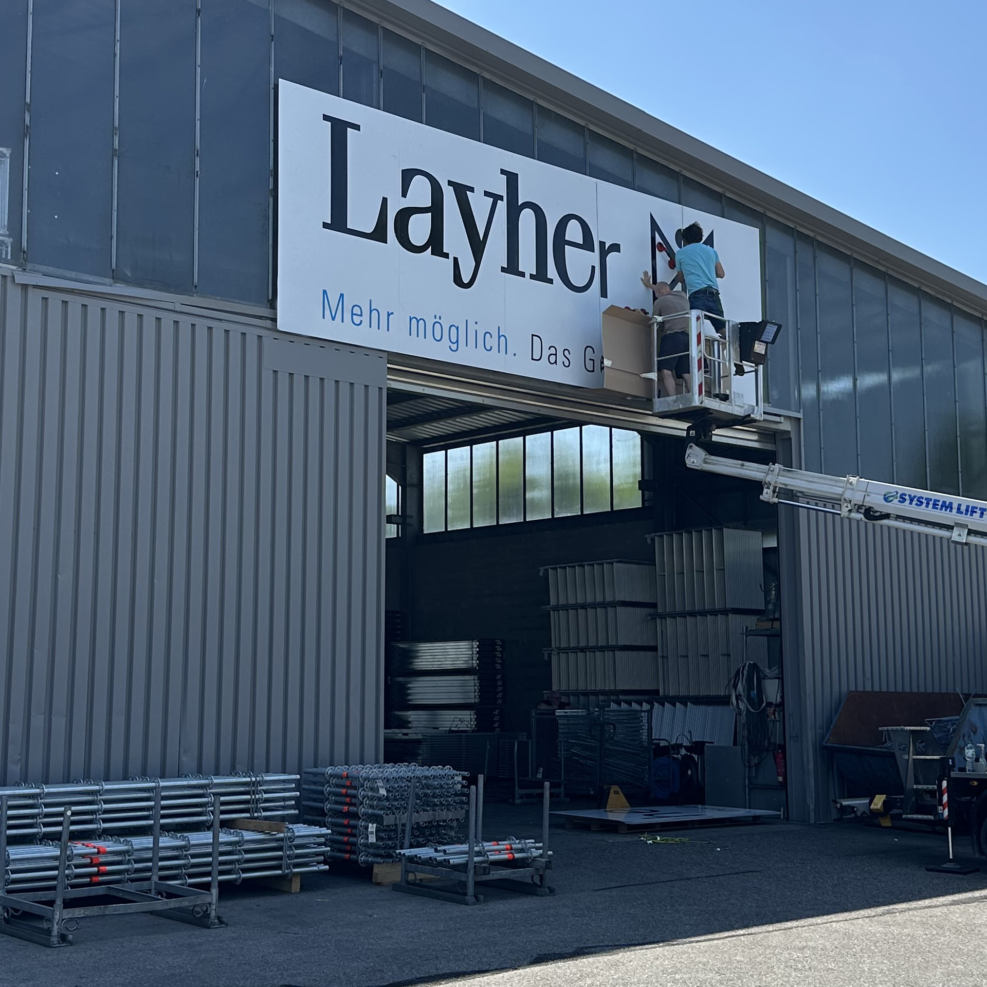 Das Ergebnis: robuste, präzise gefertigte und professionell installierte Werbeschilder, die das Markenbild von Layher klar und hochwertig präsentieren.